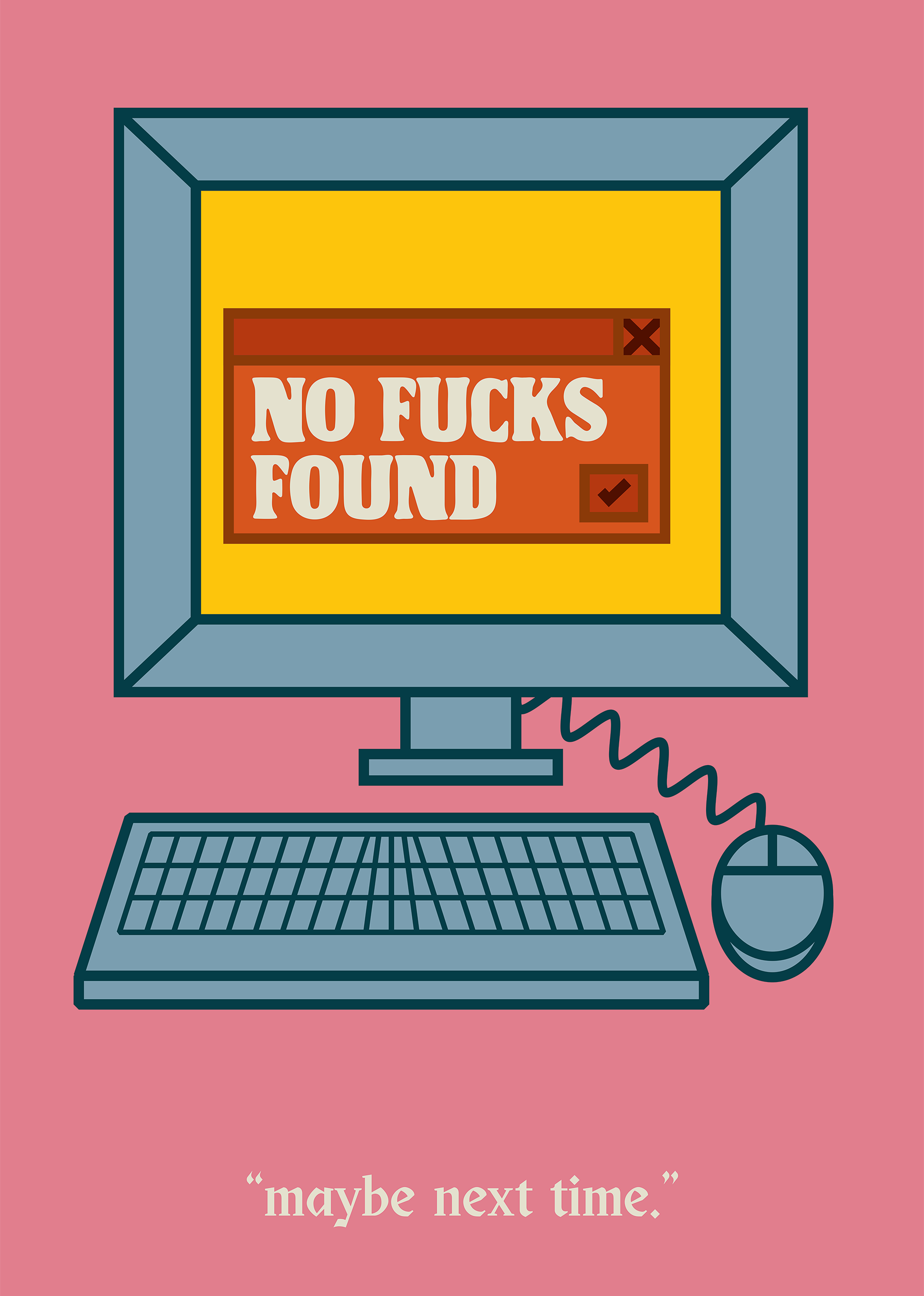 Imagine hearing the most boring story in the world. Now imagine it with this card in your bag. You could really do some damage with this ‘No Fucks Found’ card, the ‘maybe next time’ really hammers it home.